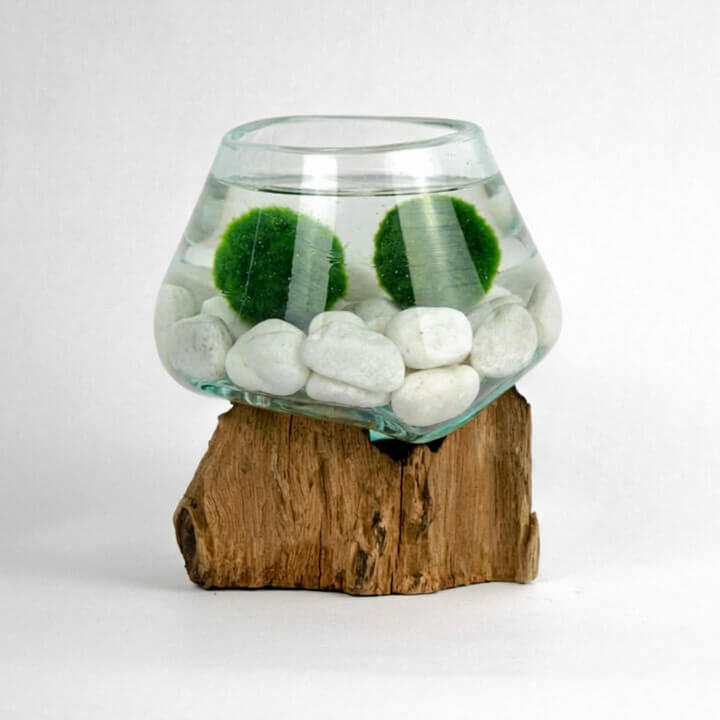 Na výrobu těchto dóz se využívá recyklované sklo, které je zpracováváno na Bali za extrémně vysokých teplot. Zkušení skláři umělecky modelují (foukají) rozpálené sklo do požadovaných tvarů a následně ho přizpůsobují unikátním kusům dřeva. Díky tomu jsou naše dózy po ztuhnutí dokonale přizpůsobeny pouze svému konkrétnímu “kořenu” a nelze je použít pro nic jiného. Výsledné dózy mají krásný namodralý nádech a vytvářejí tak velmi estetický a přírodní dojem.
